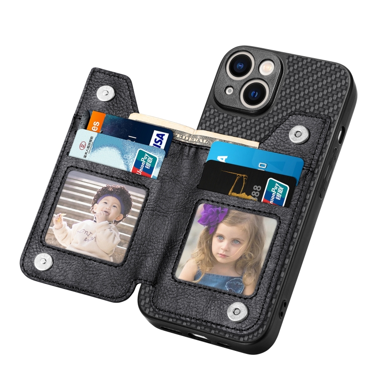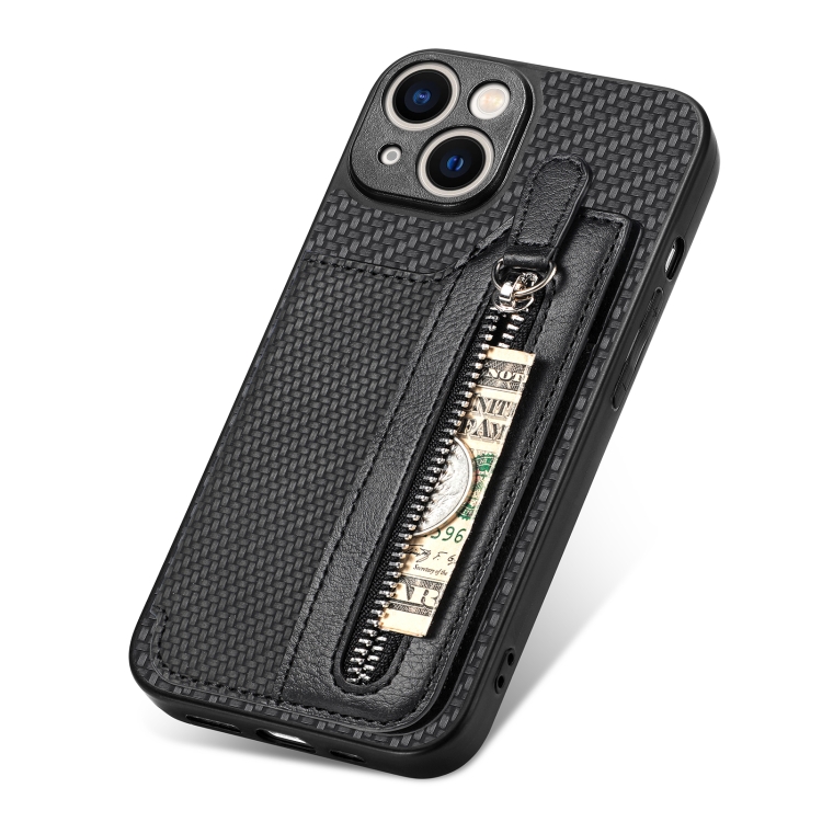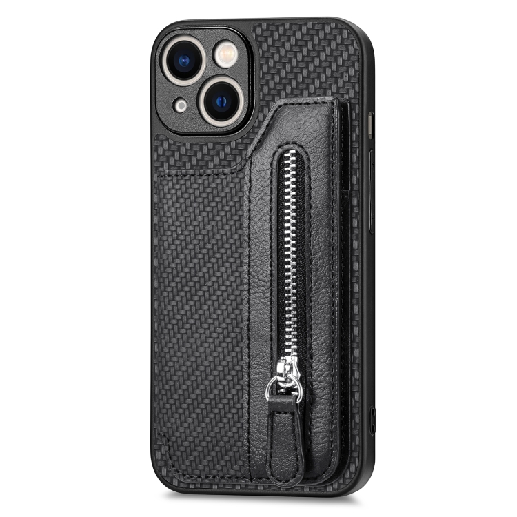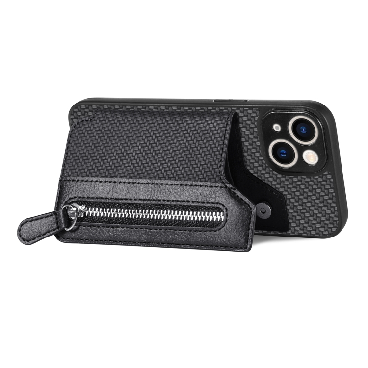 Funda de Teléfono para iPhone 14 con Cremallera y Tapa Horizontal de Fibra de Carbono (Negro)