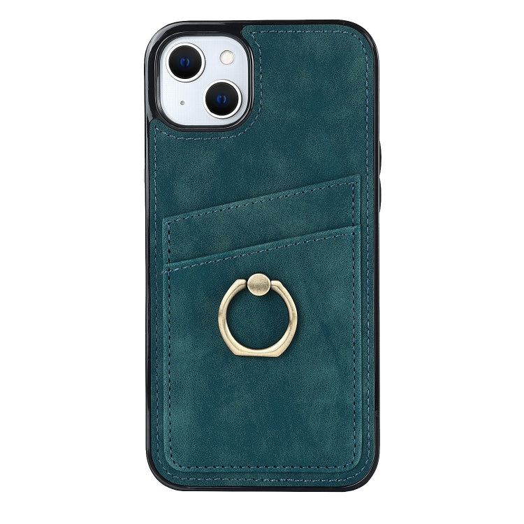 Funda de Teléfono iPhone 14 Cuero Parche Vintage Soporte para Anillo (Azul)