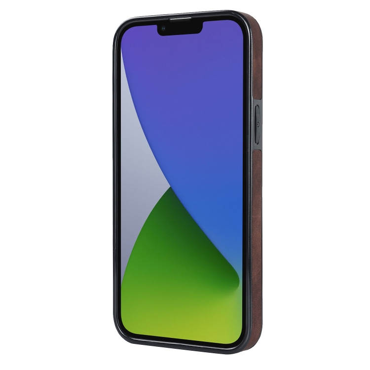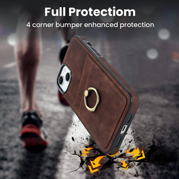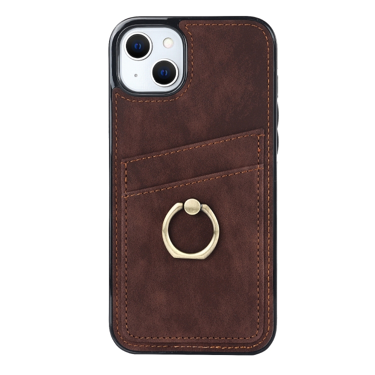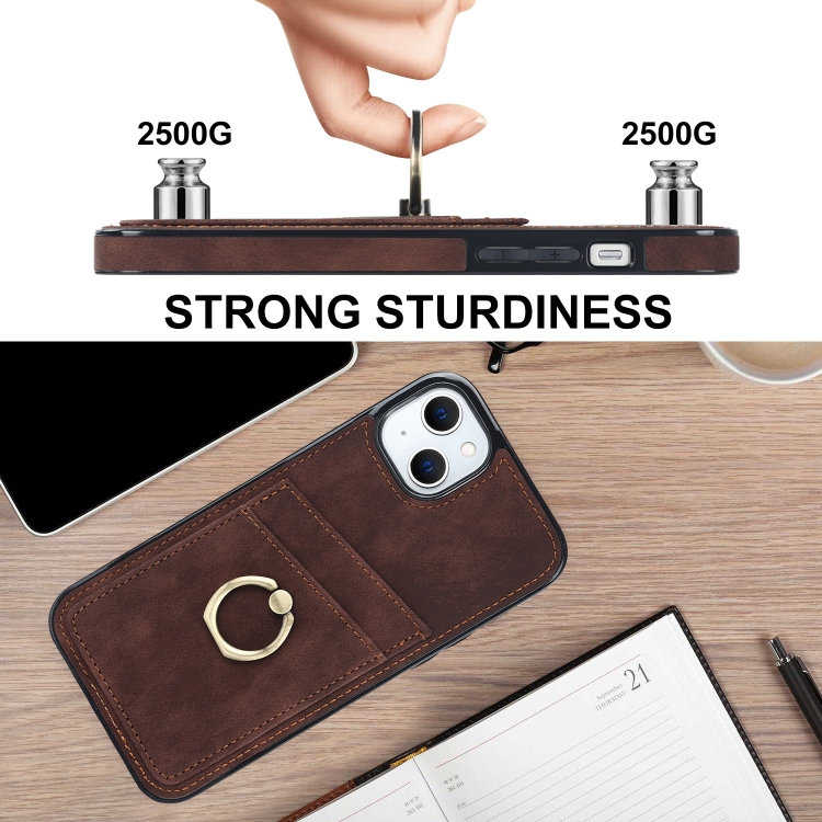 Funda de Teléfono iPhone 14 Cuero con Parche Vintage y Soporte para Anillo (Marrón)