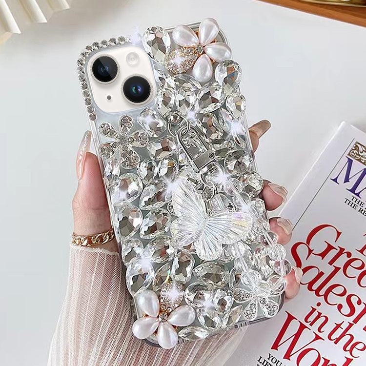 Funda para Teléfono iPhone 14 con Incrustaciones de Diamantes y Mariposas Hecha a Mano (Blanco)