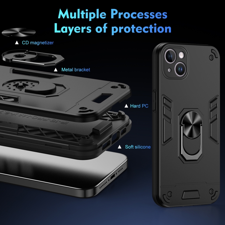 Funda para Teléfono iPhone 14 con Soporte de Anillo de Metal a Prueba de Golpes (Negro)