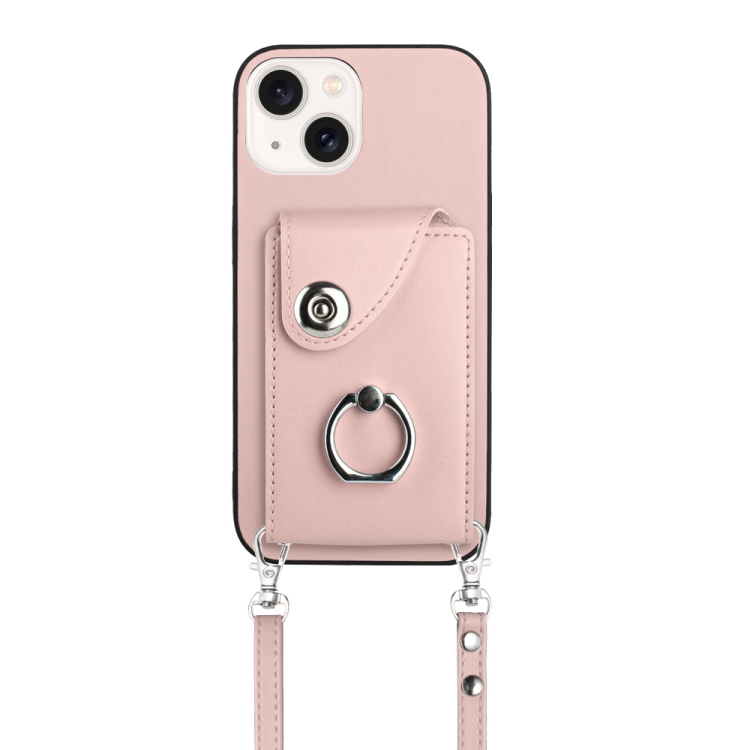 Funda para Teléfono iPhone 14 con Soporte para Anillo y Bolsa para Tarjeta con Cordón Largo (Rosa)