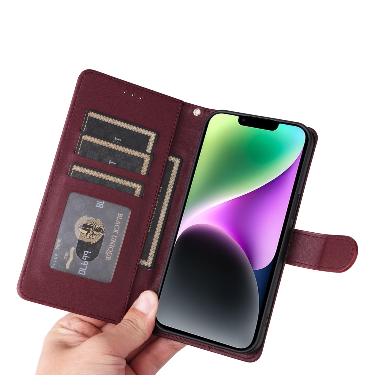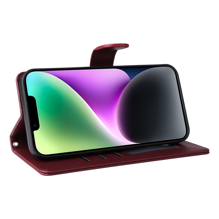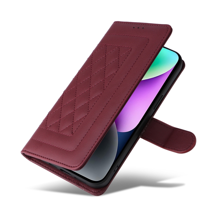 Funda para Teléfono iPhone 14 con Tapa de Cuero Diamond Lattice (Rojo Vino)