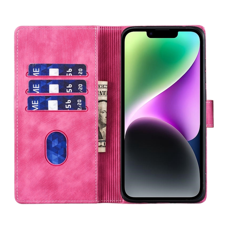 Funda para Teléfono iPhone 14 Cuero Relieve Gato y Corazón (Rosa)