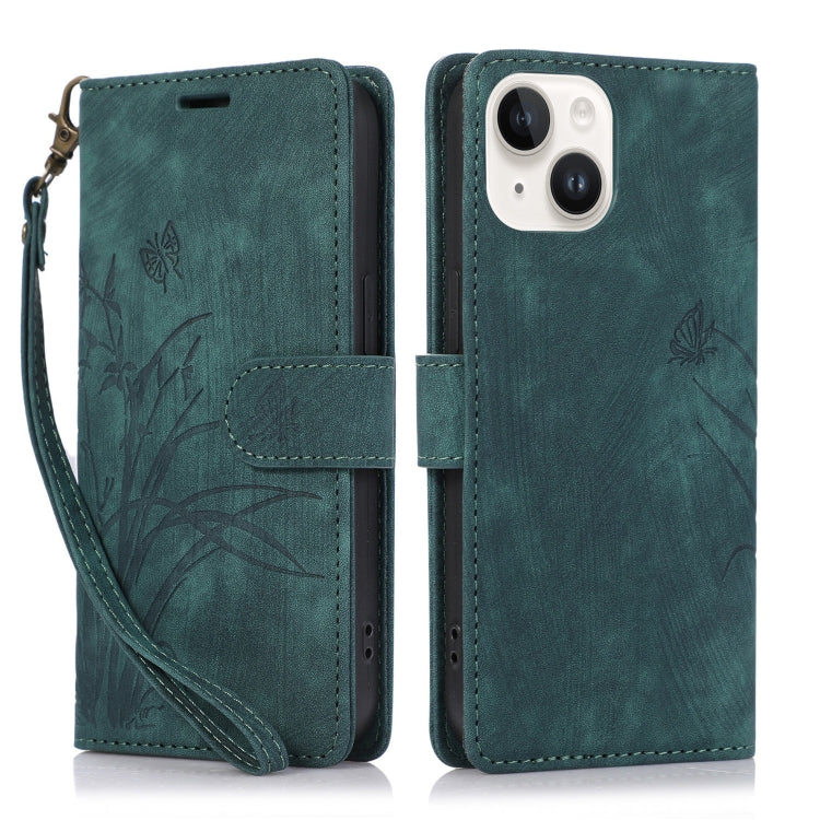 Funda para Teléfono iPhone 14 Cuero Relieve Mariposa Orquídea (Verde)