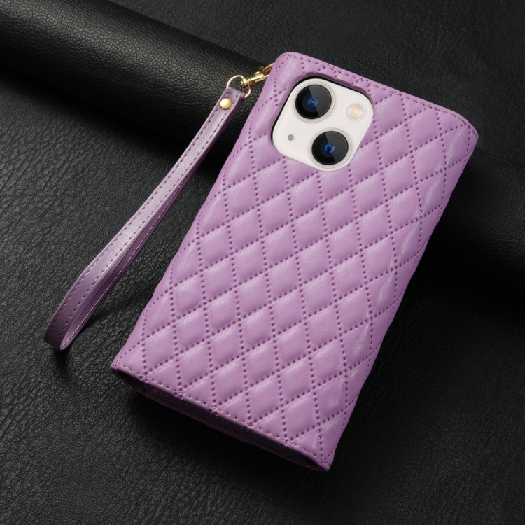 Funda para Teléfono iPhone 14 Cuero Rómbico con Billetera MultiTarjeta y Cremallera (Púrpura)