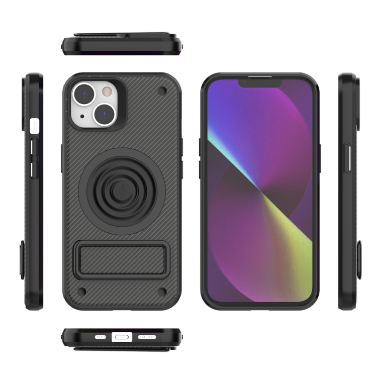 Funda para Teléfono iPhone 14 PC + TPU Textura Fibra de Carbono con Soporte de Metal (Negro)