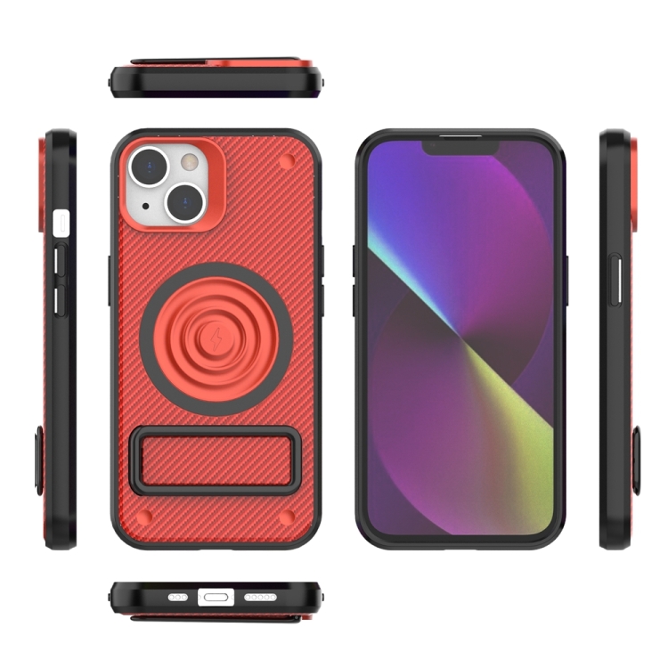 Funda para Teléfono iPhone 14 PC + TPU Textura Fibra de Carbono Soporte Metal (Rojo)