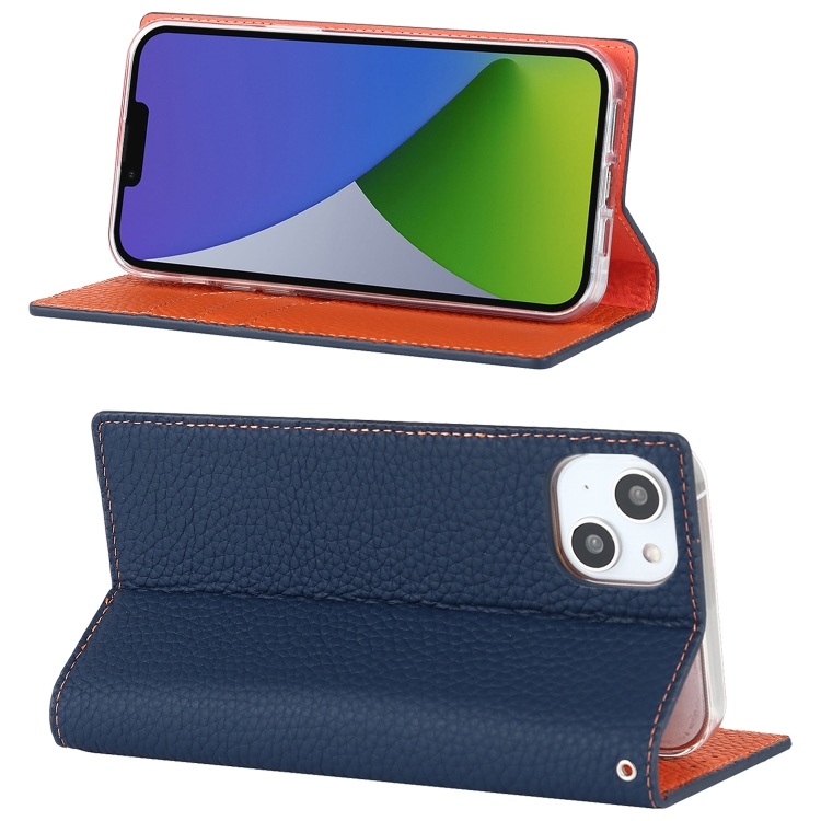 Funda de teléfono para iPhone 14 Litchi Texture de cuero genuino (Azul Oscuro)