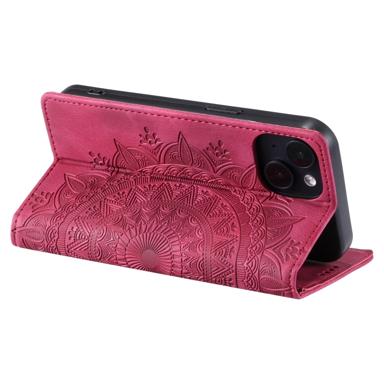 Estuche para Teléfono iPhone 14 Plus Cuero Magnético Relieve de Tótem (Rojo)