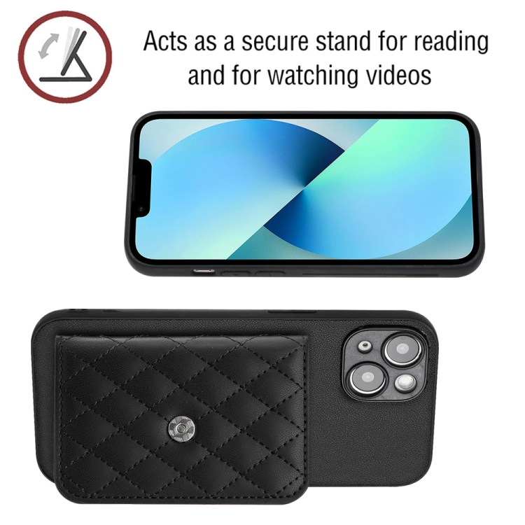 Estuche para Teléfono iPhone 14 Plus Rfid con Bolsa para Tarjetas Textura Rómbica Cordón Largo (Negro)