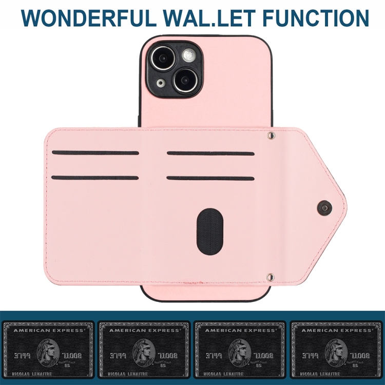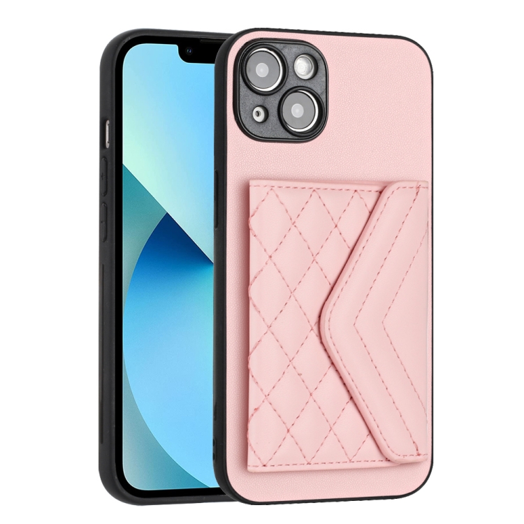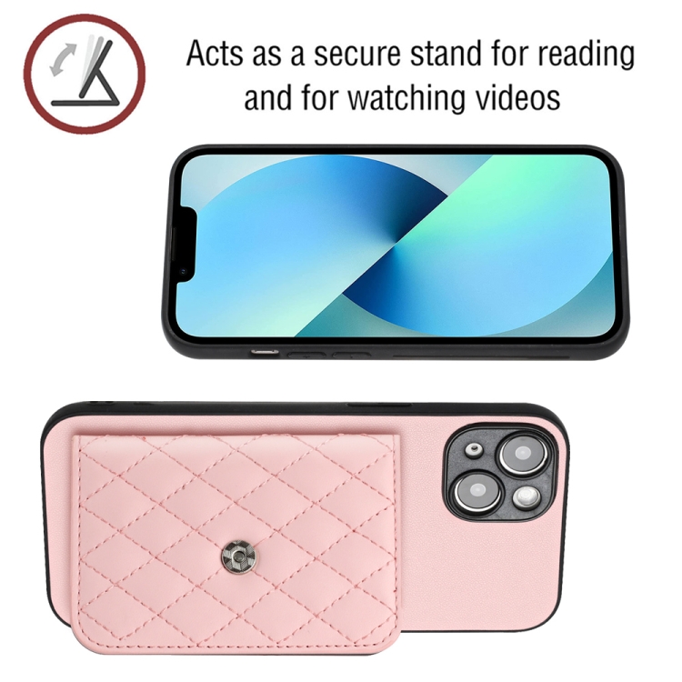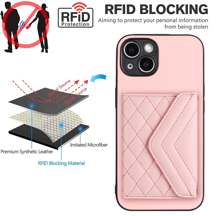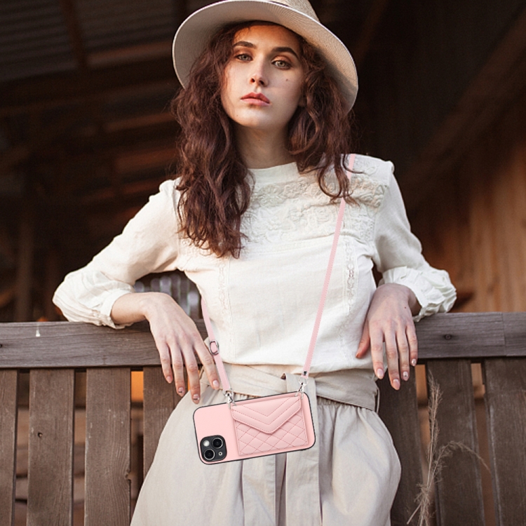 Estuche para Teléfono iPhone 14 Plus Rfid Bolsa para Tarjetas Textura Rómbica Cordón Largo (Oro Rosa)