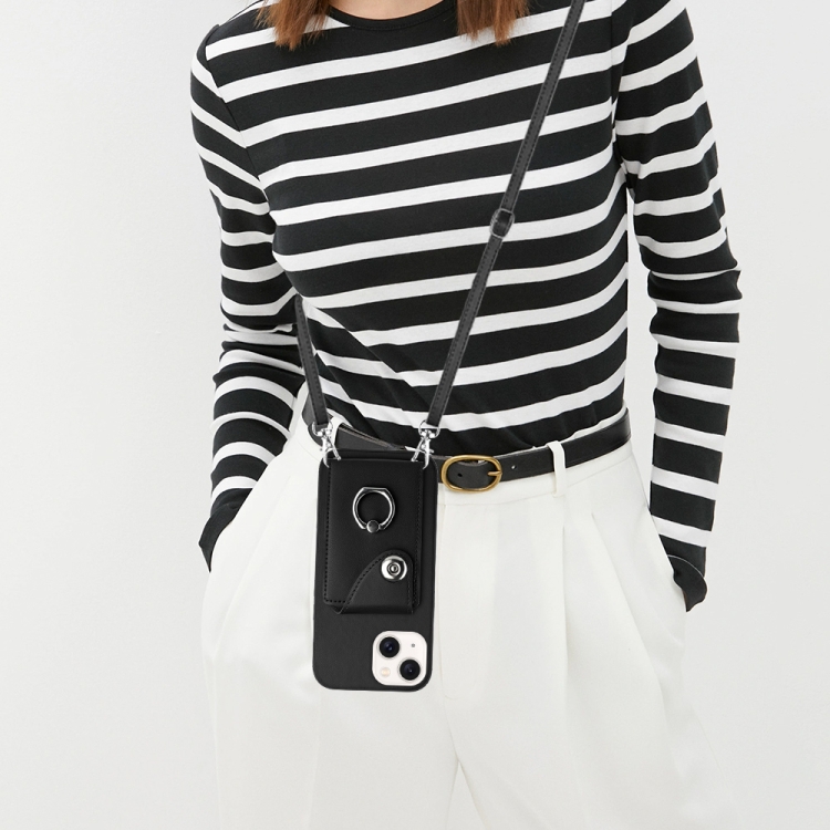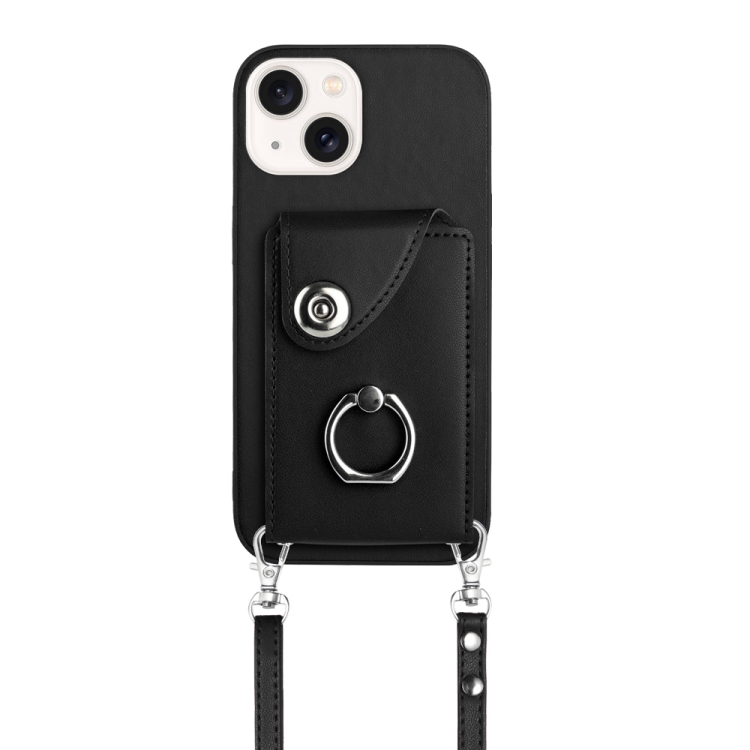 Funda para Teléfono iPhone 14 Plus con Soporte para Anillo y Bolsa para Tarjeta con Cordón Largo (Negro)