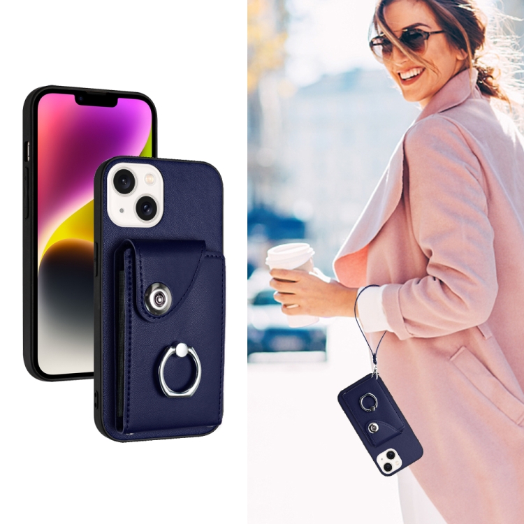 Funda para Teléfono iPhone 14 Plus PU con Soporte para Anillo y Bolsa para Tarjeta con Cordón (Azul)