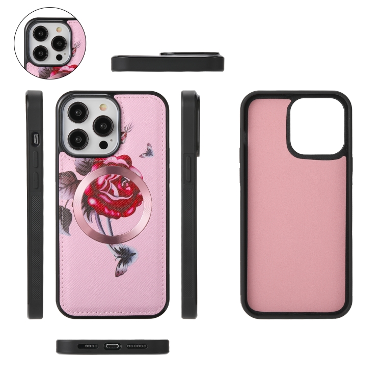 Funda para Teléfono iPhone 14 Plus Magsafe Flower Cuero con Billetera Cruzada Multifuncional con Cremallera (Rosa)