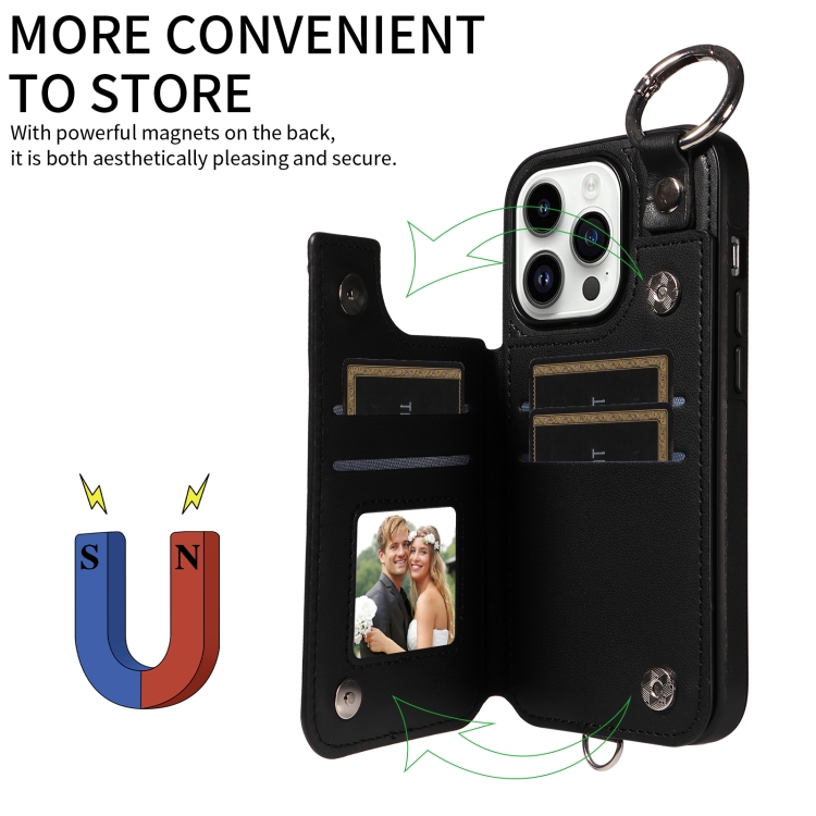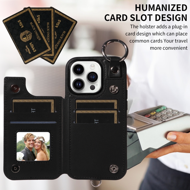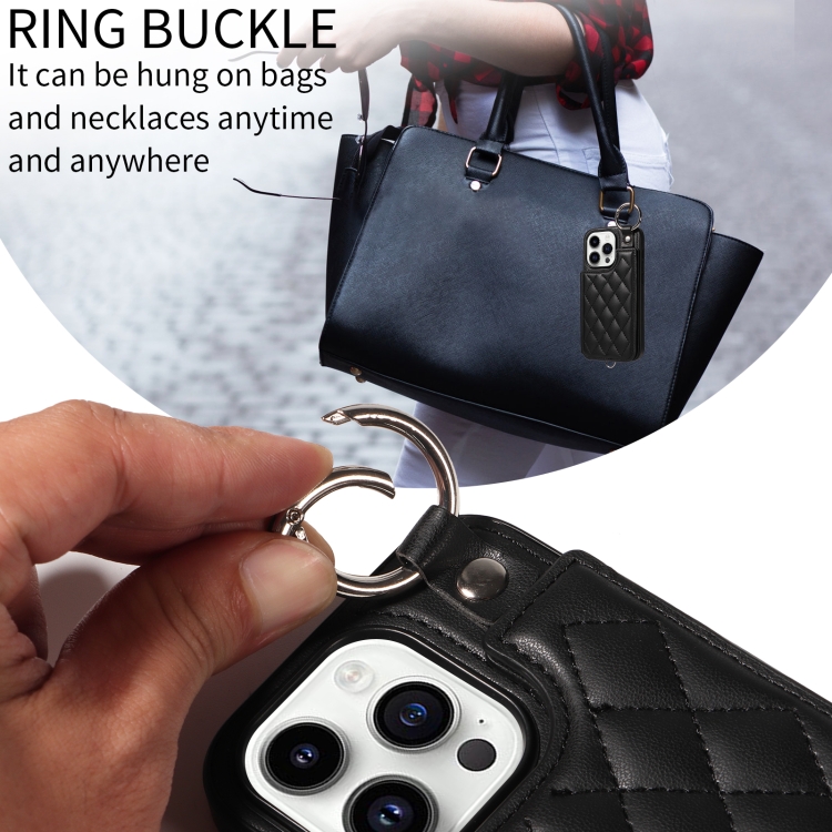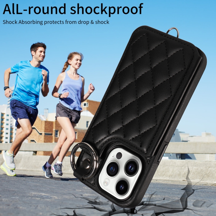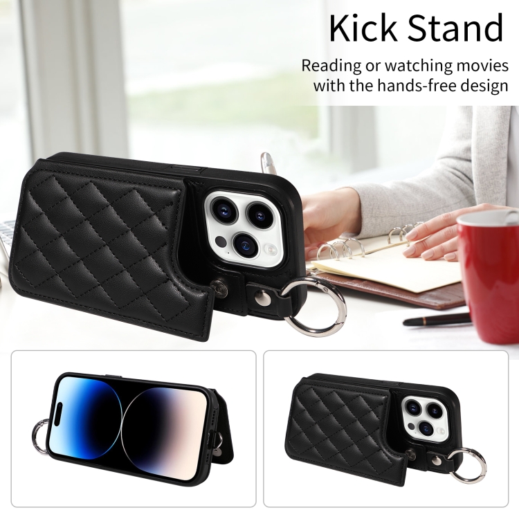 Estuche para Teléfono iPhone 14 Pro Bolsa para Tarjetas Textura Rómbica Cordón Corto (Negro)