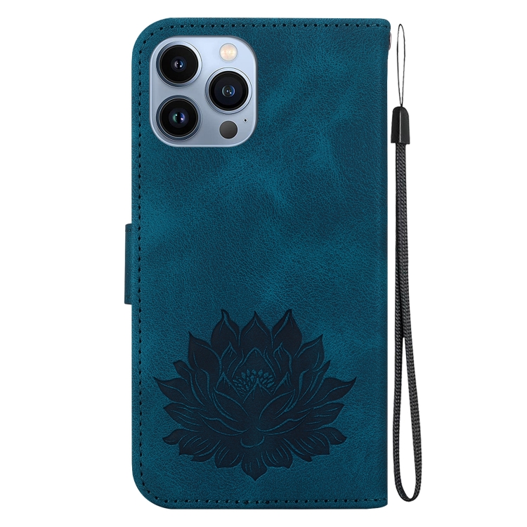 Funda de Cuero para iPhone 14 Pro con Relieve de Loto (Azul Oscuro)