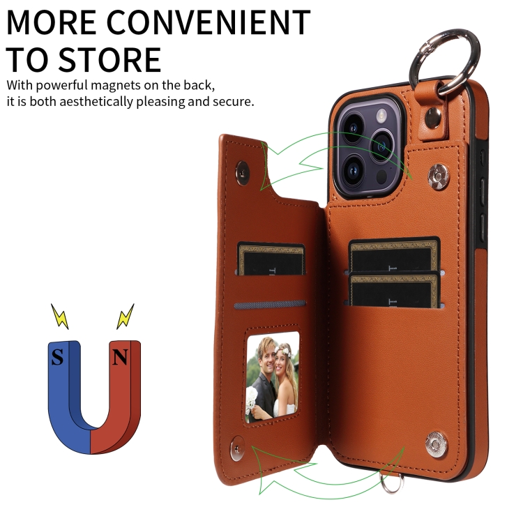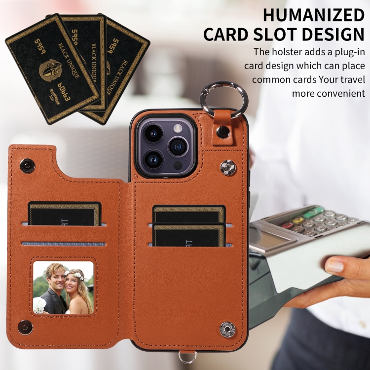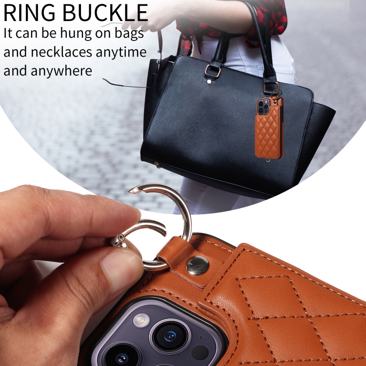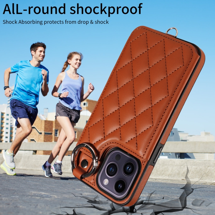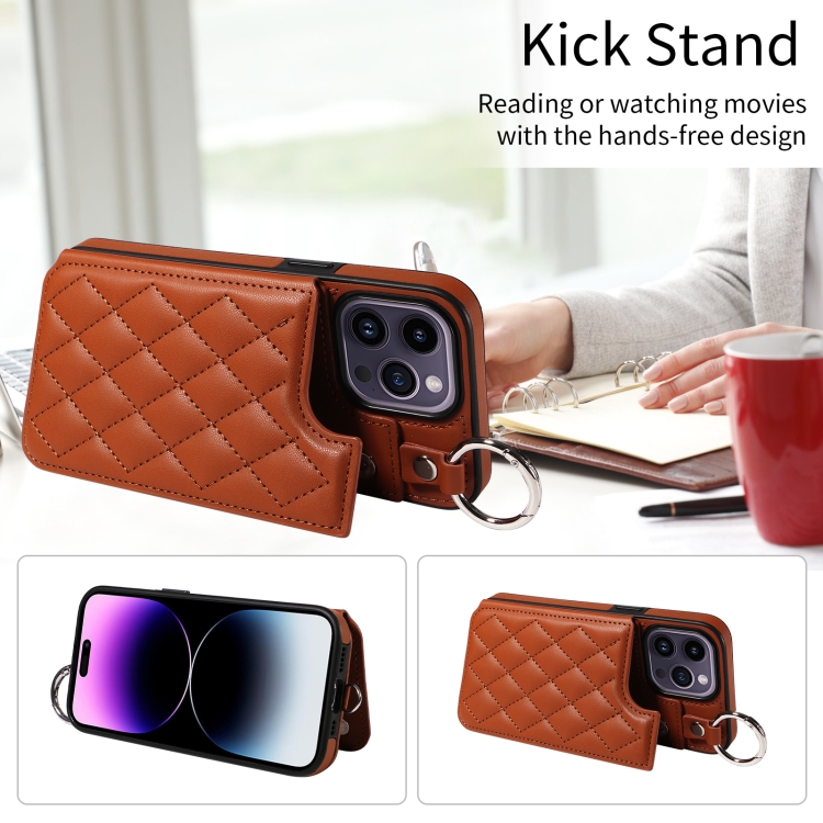 Estuche para teléfono iPhone 14 Pro Max con bolsa para tarjetas textura rómbica y cordón corto (Marrón)