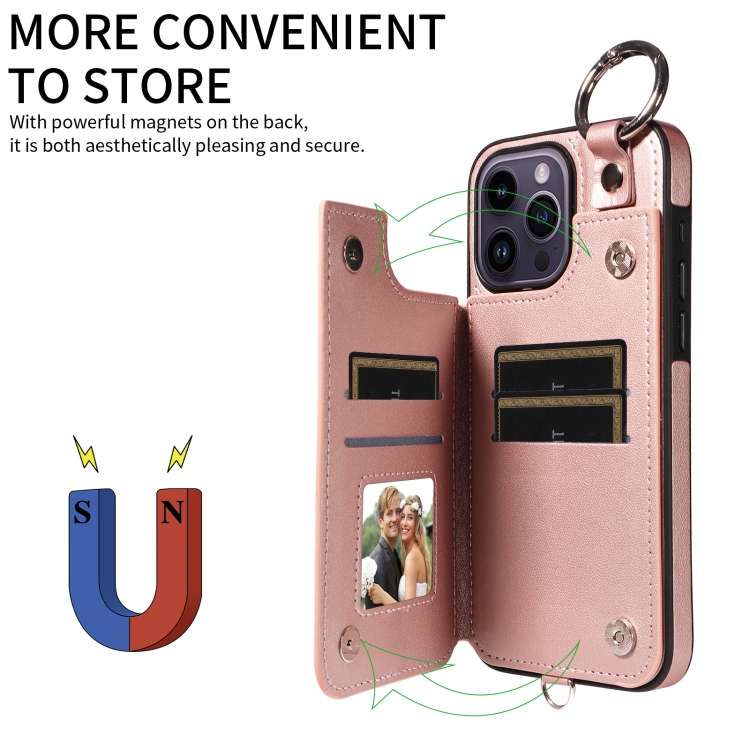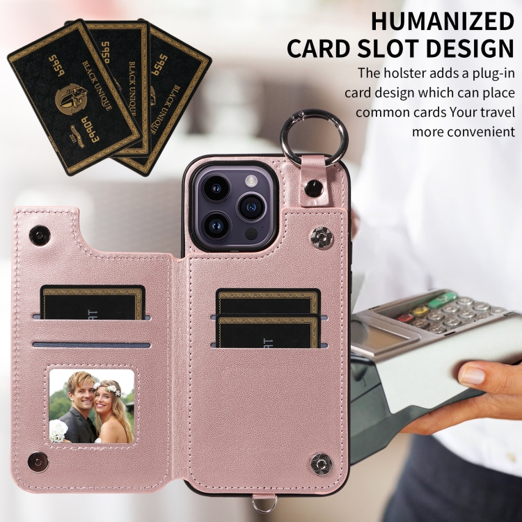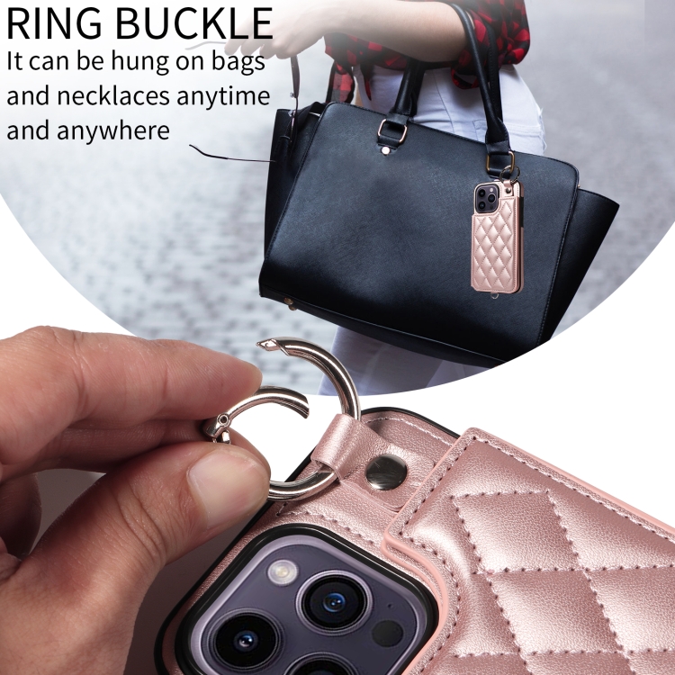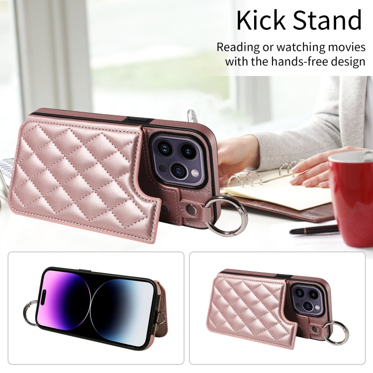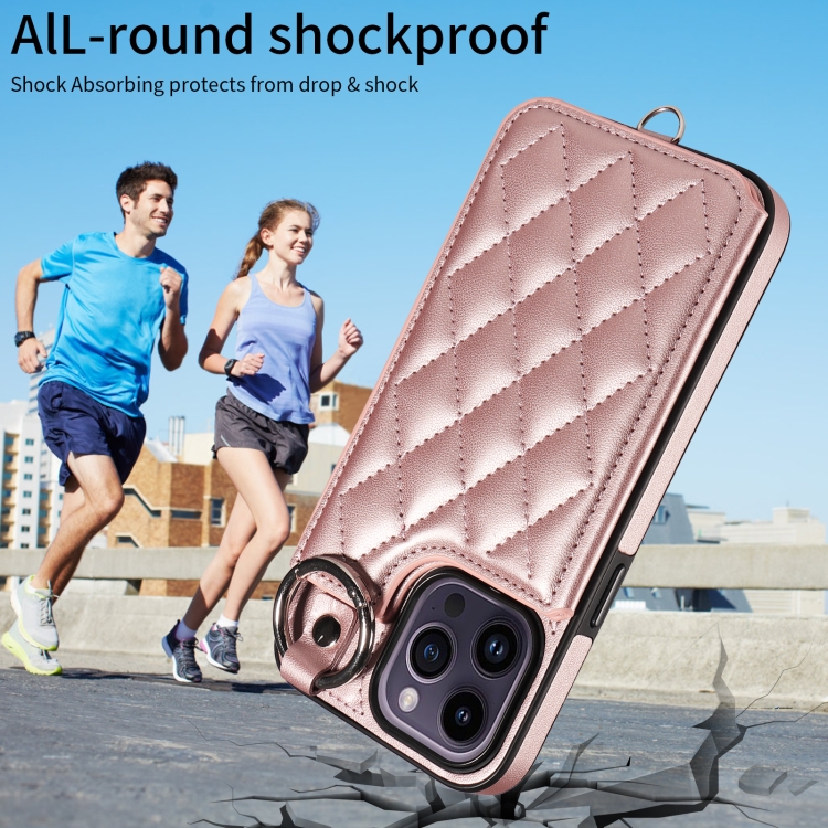 Estuche para Teléfono iPhone 14 Pro Max con Bolsa para Tarjetas Textura Rómbica y Cordón Corto (Oro Rosa)