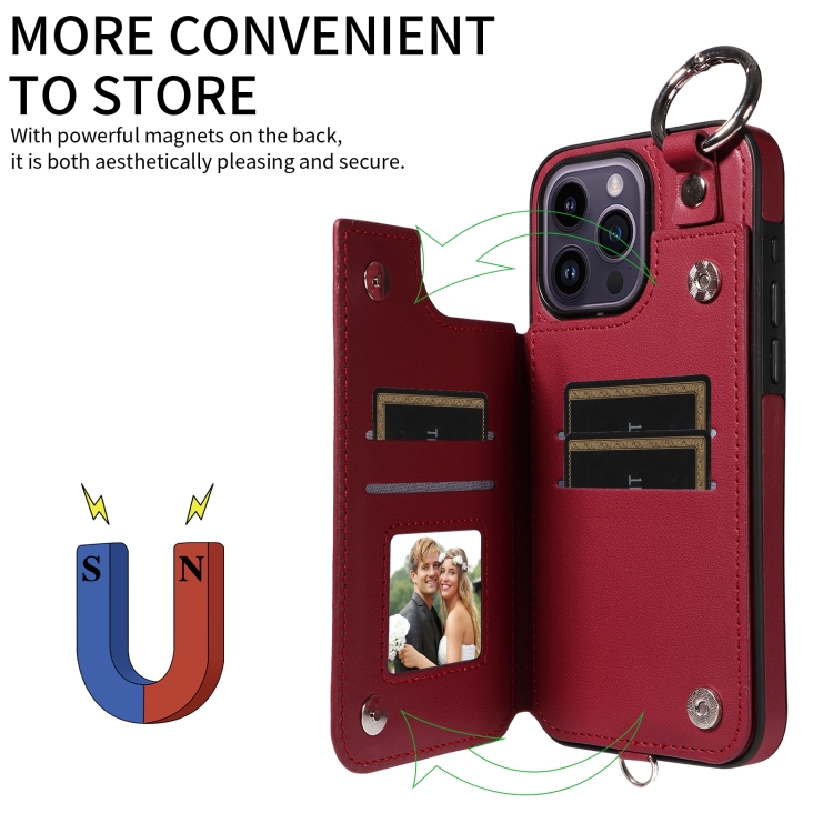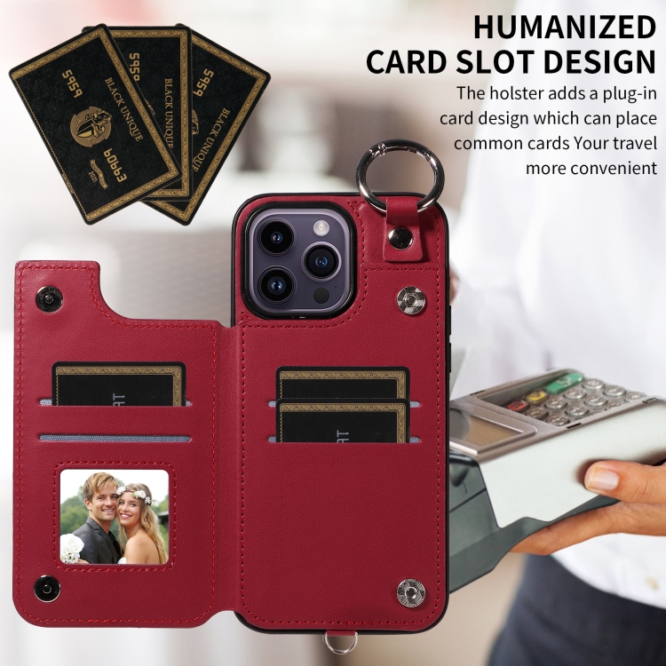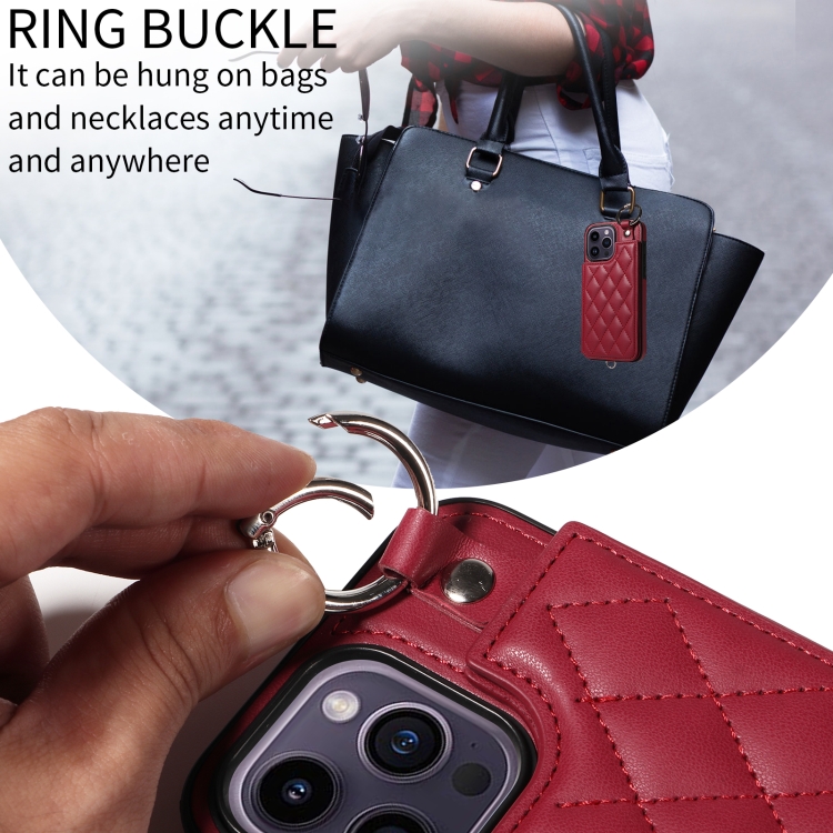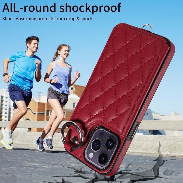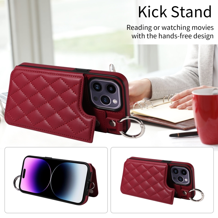 Estuche para teléfono iPhone 14 Pro Max con bolsa para tarjetas textura rómbica y cordón corto (Rojo Vino)