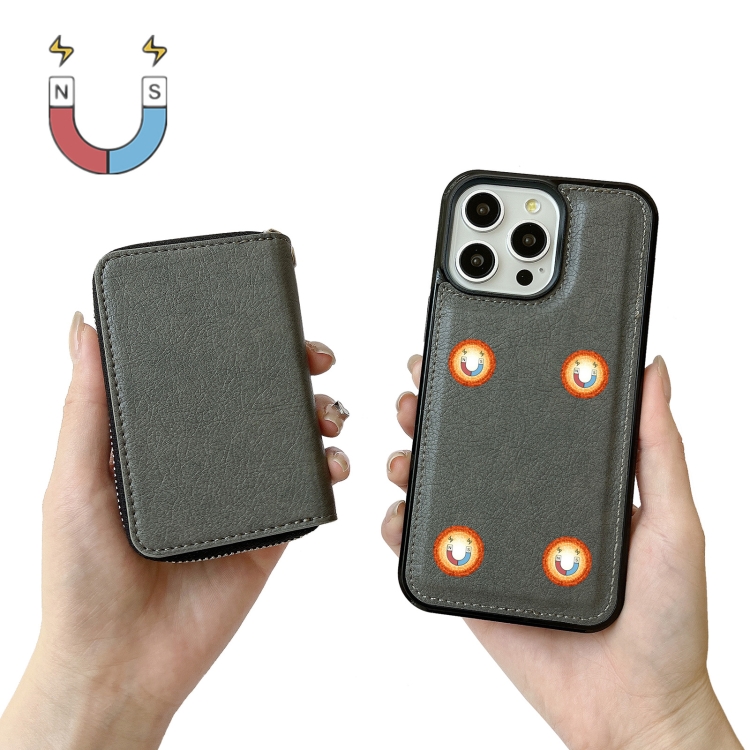 Funda para teléfono iPhone 14 Pro Max con bolsa, ranuras para 11 tarjetas y cremallera (Gris)
