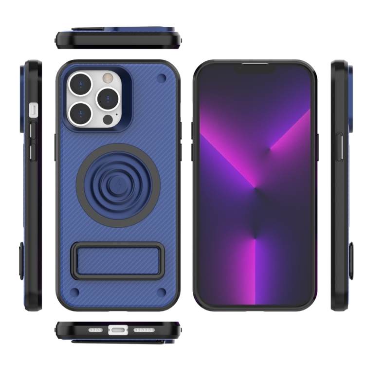 Funda para Teléfono iPhone 14 Pro Max PC + TPU Textura Fibra de Carbono Soporte Metal (Azul)