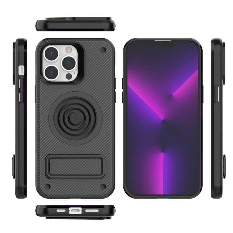 Funda para Teléfono iPhone 14 Pro Max PC + TPU Textura Fibra de Carbono con Soporte de Metal (Negro)