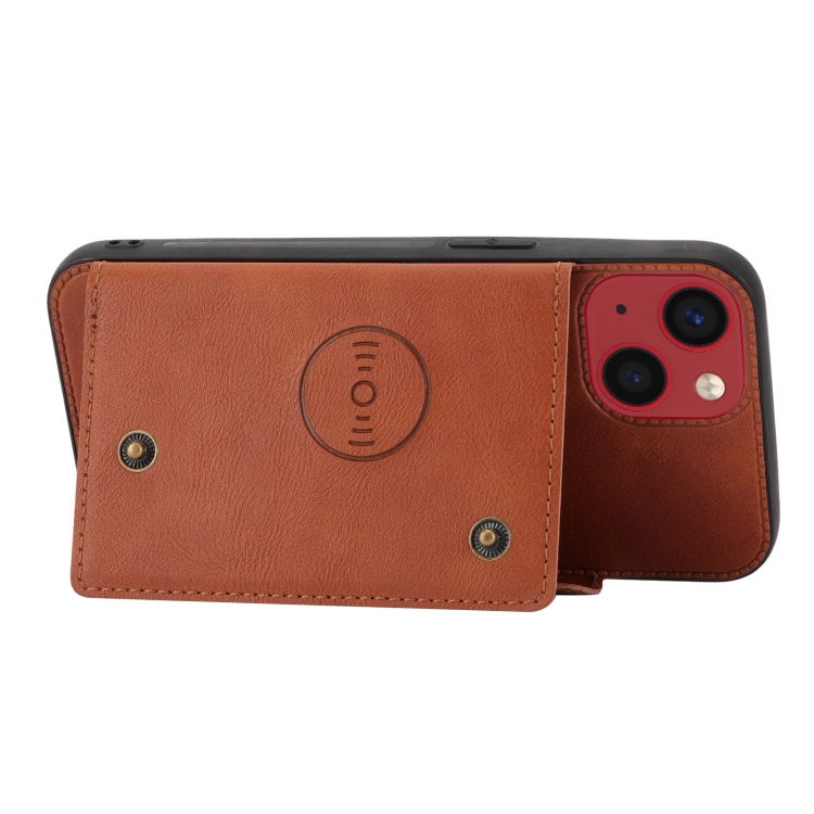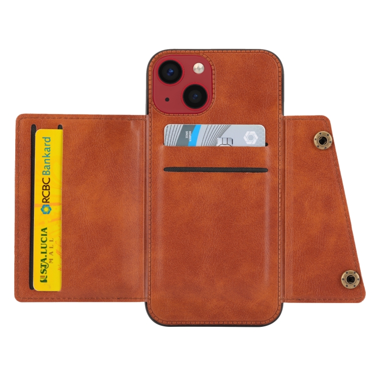 Funda para Teléfono iPhone 14 Ranuras para Tarjetas con Doble Hebilla PU + TPU (Marrón)