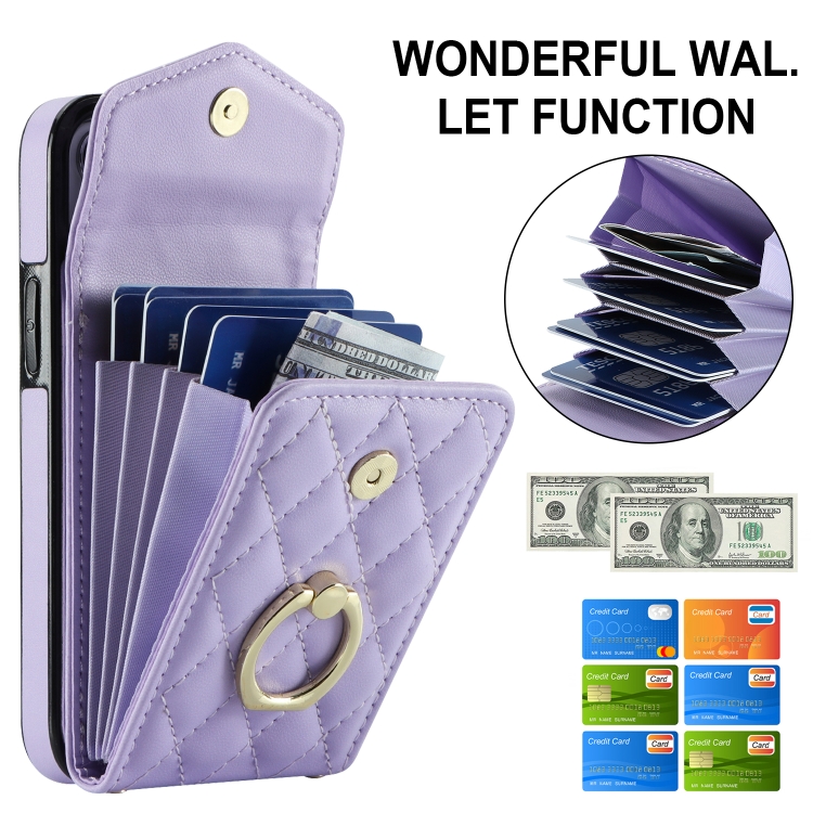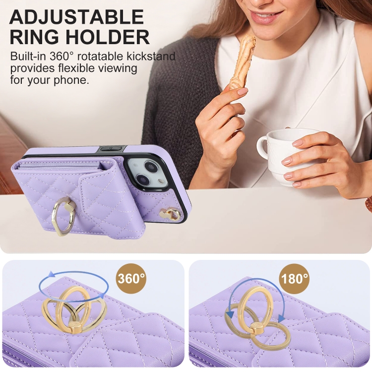 Funda para Teléfono iPhone 14 Rhombic Texture Card Bag con Cordón Largo (Púrpura Claro)