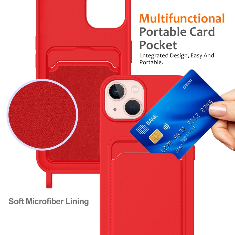 Funda para Teléfono iPhone 15 Bolsa para Tarjeta Integrada Silicona Líquida con Cordón (Rojo)
