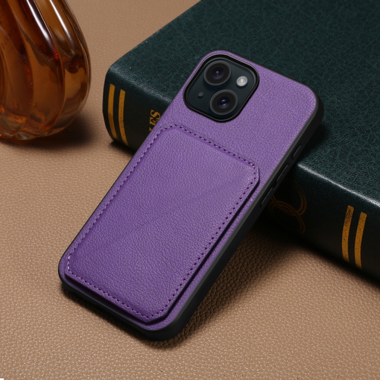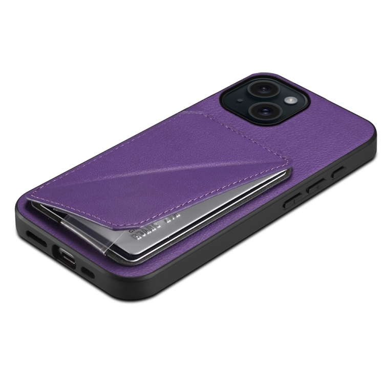 Funda para Teléfono iPhone 15 D04 con Ranura para Tarjeta Dual Textura de Becerro (Púrpura)