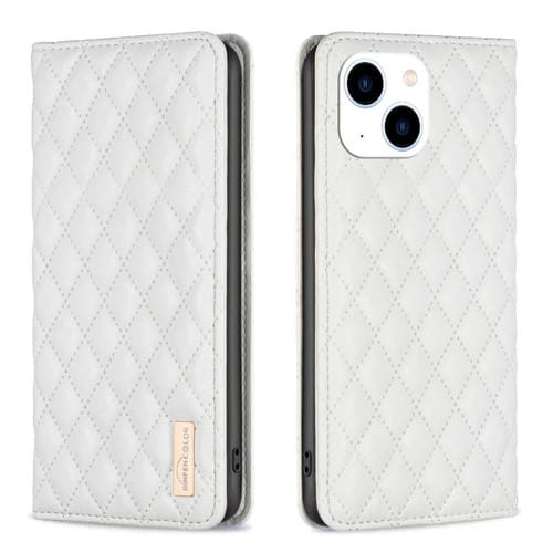 Funda Flip para iPhone 15 Diamond Lattice Leather Magnética (Blanco)