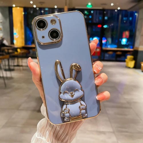 Estuche para teléfono iPhone 15 con soporte de conejo chapado (Azul)