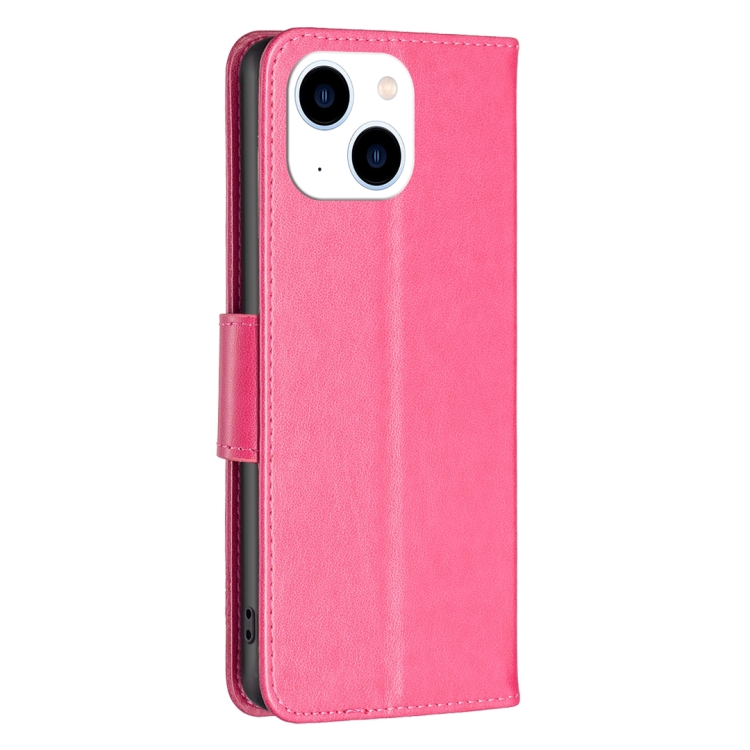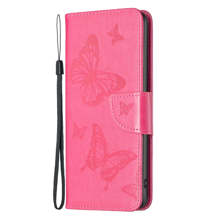 Estuche para Teléfono iPhone 15 Cuero con Patrón de Dos Mariposas en Relieve (Rosa Roja)