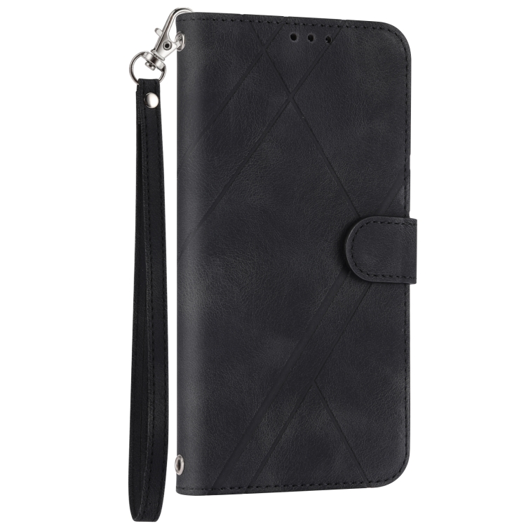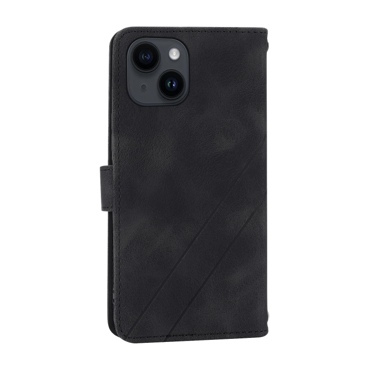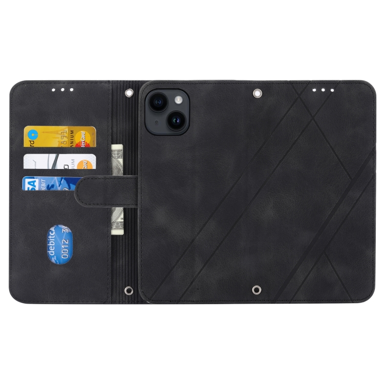Funda de Cuero para iPhone 15 con Línea en Relieve y Cordón (Negro)
