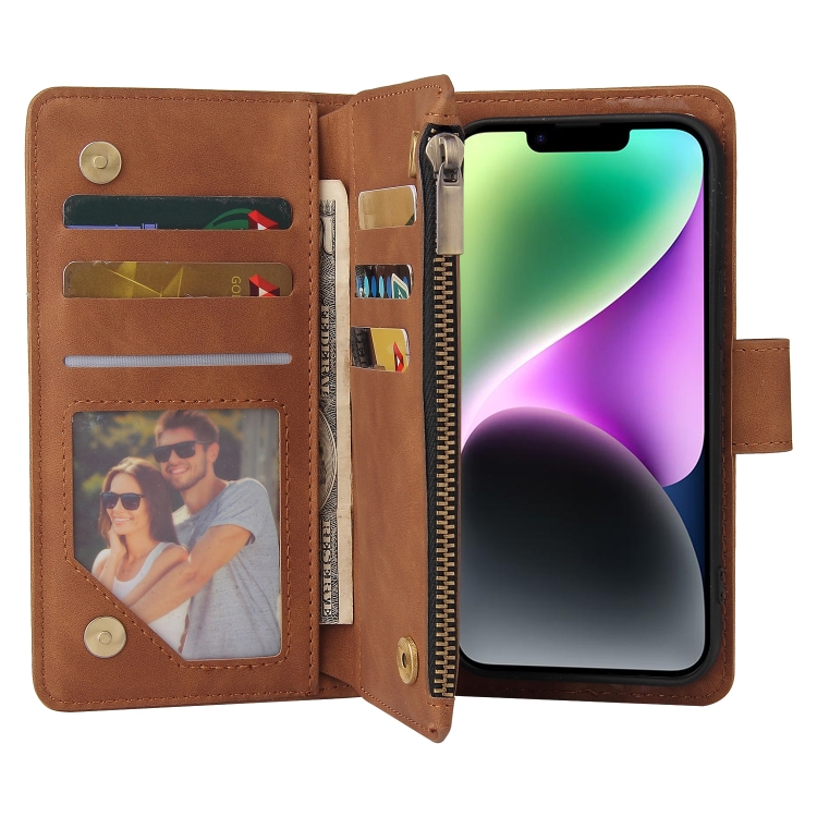 Funda de Cuero para Teléfono iPhone 15 con Billetera MultiTarjeta Multifuncional (Marrón)