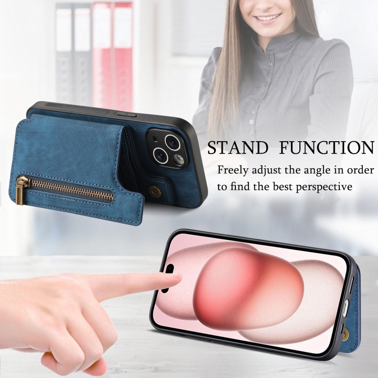 Funda de Cuero Retro para iPhone 15 con Cremallera y Billetera (Azul)