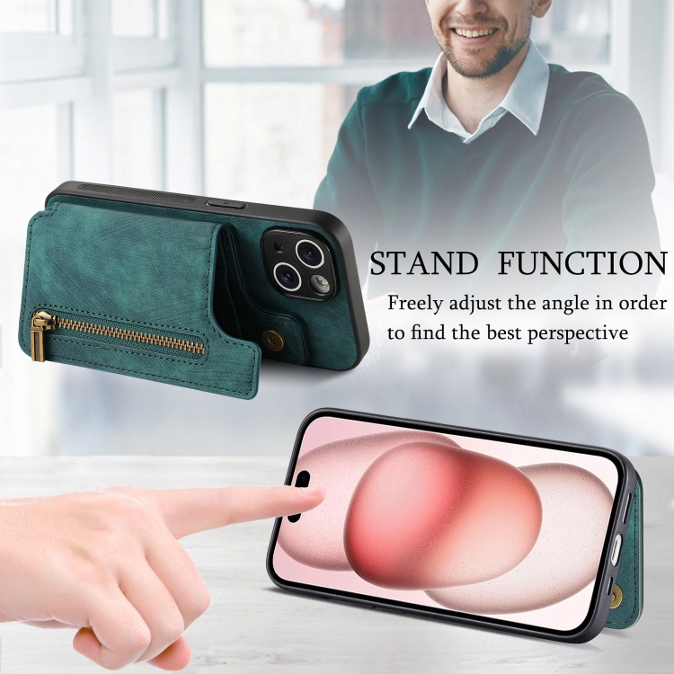 Funda para iPhone 15 de Cuero Retro con Cremallera y Billetera (Verde)