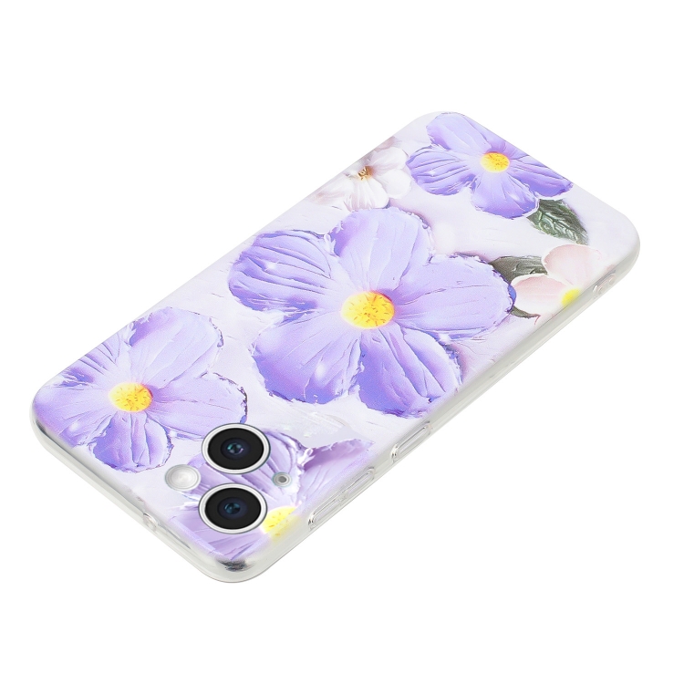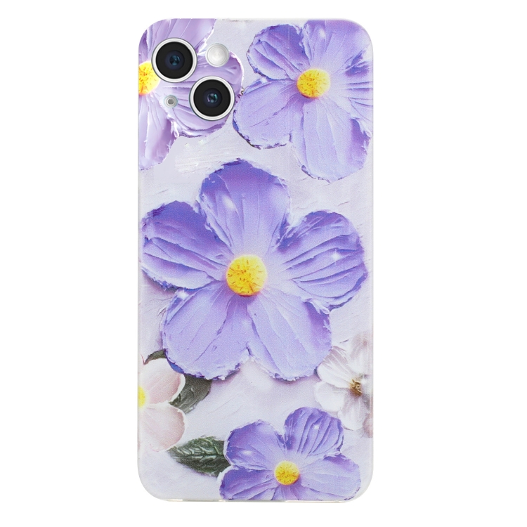 Funda de teléfono TPU para iPhone 15 con patrón de pintura colorida (Flores Moradas)