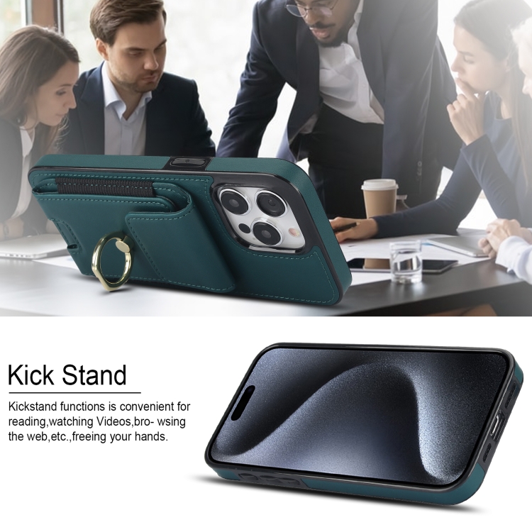 Funda Elástica para Teléfono iPhone 15 con Soporte para Anillo y Bolsa para Tarjetas (Verde Oscuro)