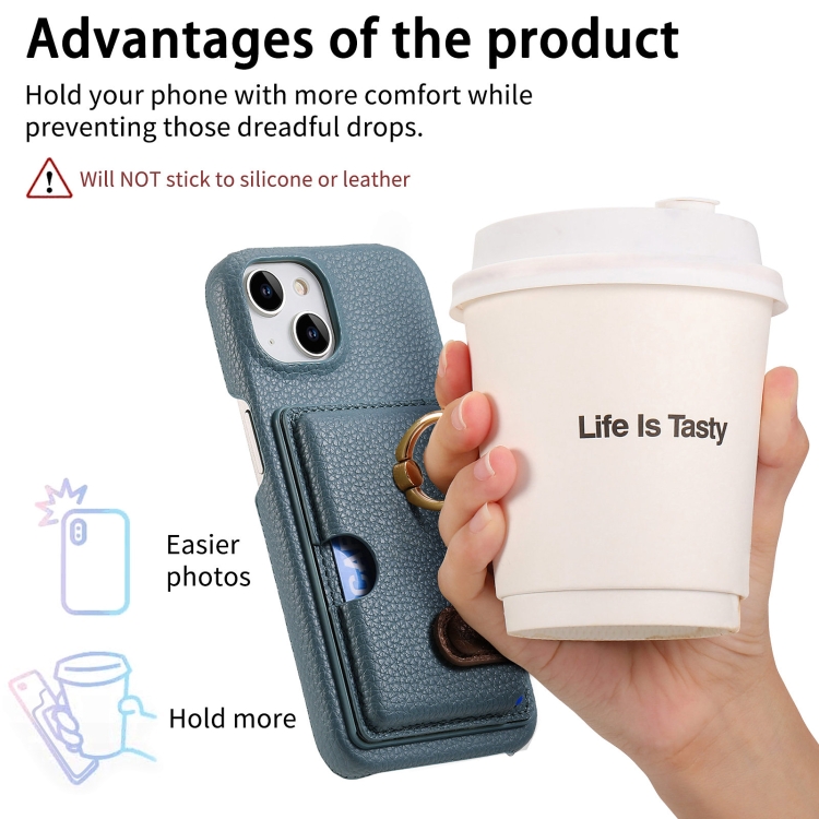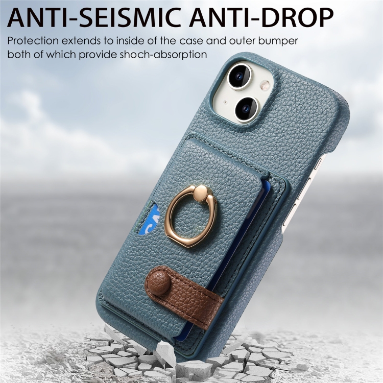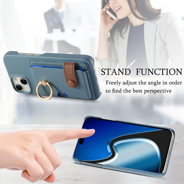 Funda para Teléfono iPhone 15 con Parte Posterior de Tarjeta y Anillo de Borde de Cuero Litchi (Azul Claro)