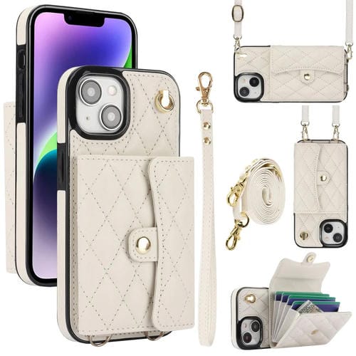 Funda para Teléfono iPhone 15 Cuero con Billetera Horizontal Rombal Cruzada (Blanco)