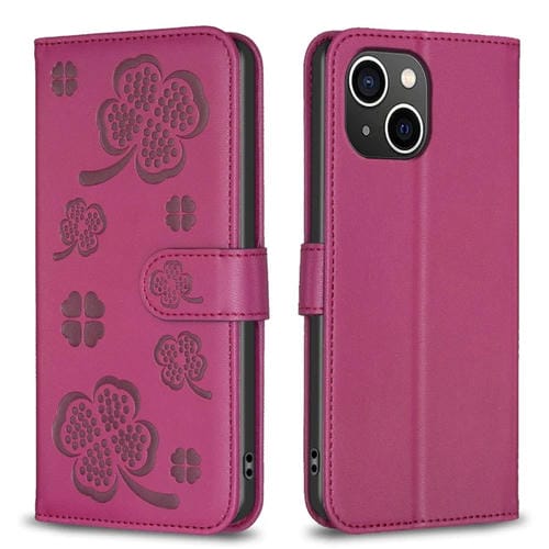 Funda para Teléfono iPhone 15 Cuero Relieve Cuatro Hojas (Rojo Rosa)