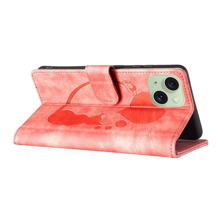 Funda para Teléfono iPhone 15 Cuero Relieve Gato y Corazón (Naranja)