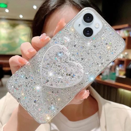 Funda para Teléfono TPU Epoxi iPhone 15 con Soporte Espejo Lentejuelas Estrelladas (Plateado)