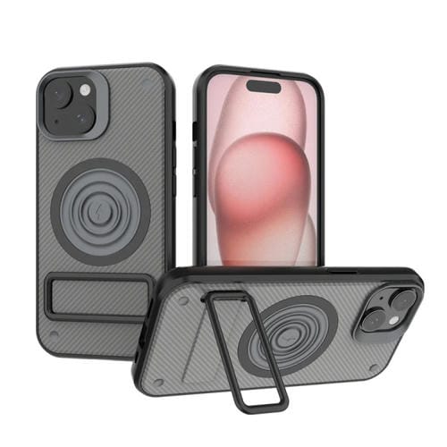 Funda para Teléfono iPhone 15 PC + TPU con Textura de Fibra de Carbono y Soporte de Metal (Gris)