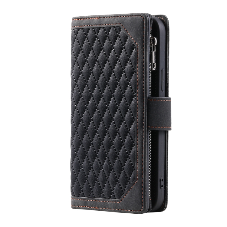 Funda de Cuero para iPhone 15 Grid Texture con Cremallera y Cordón (Negro)