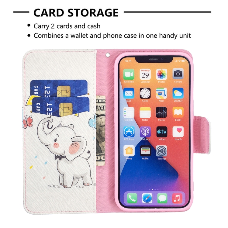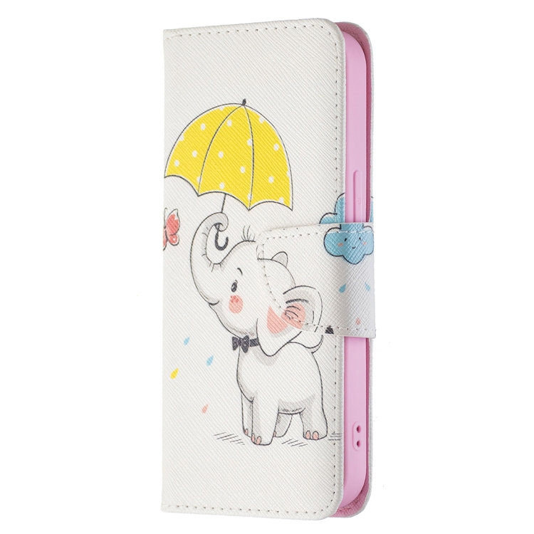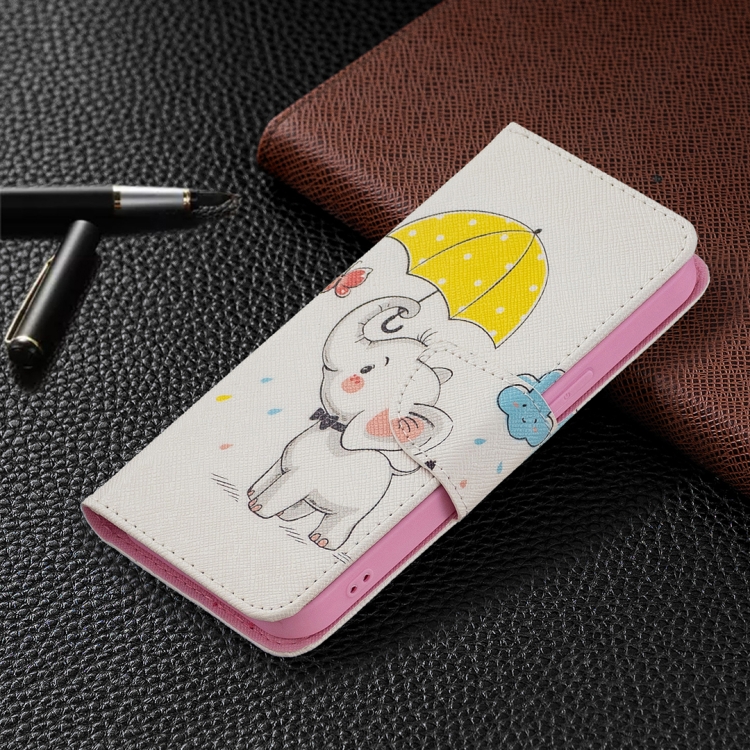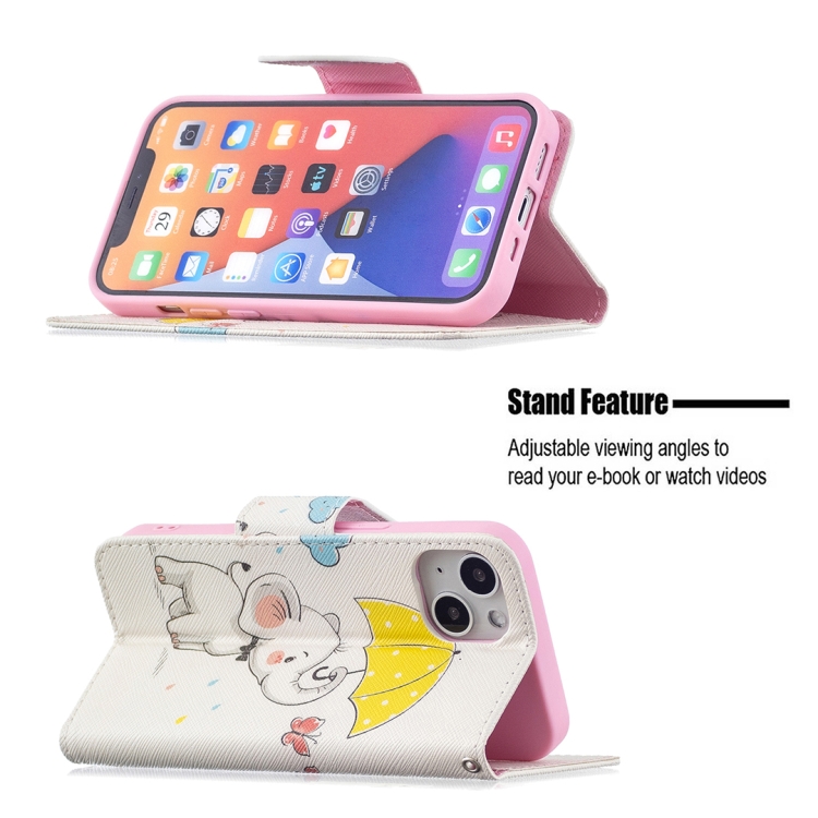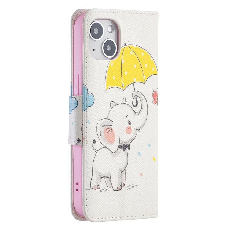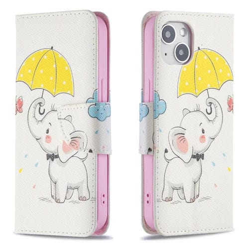 Funda de Cuero Flip para iPhone 15 Patrón de Dibujo Coloreado (Paraguas Elefante)