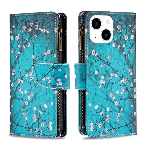 Funda para iPhone 15 Patrón de Dibujo Coloreado Cuero con Cremallera (Flor de Ciruelo)
