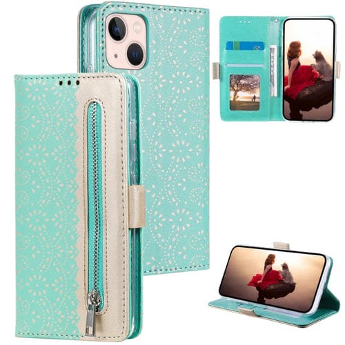 Funda de Cuero para iPhone 15 Patrón de Encaje Botón Doble Cremallera con Cordón (Verde)